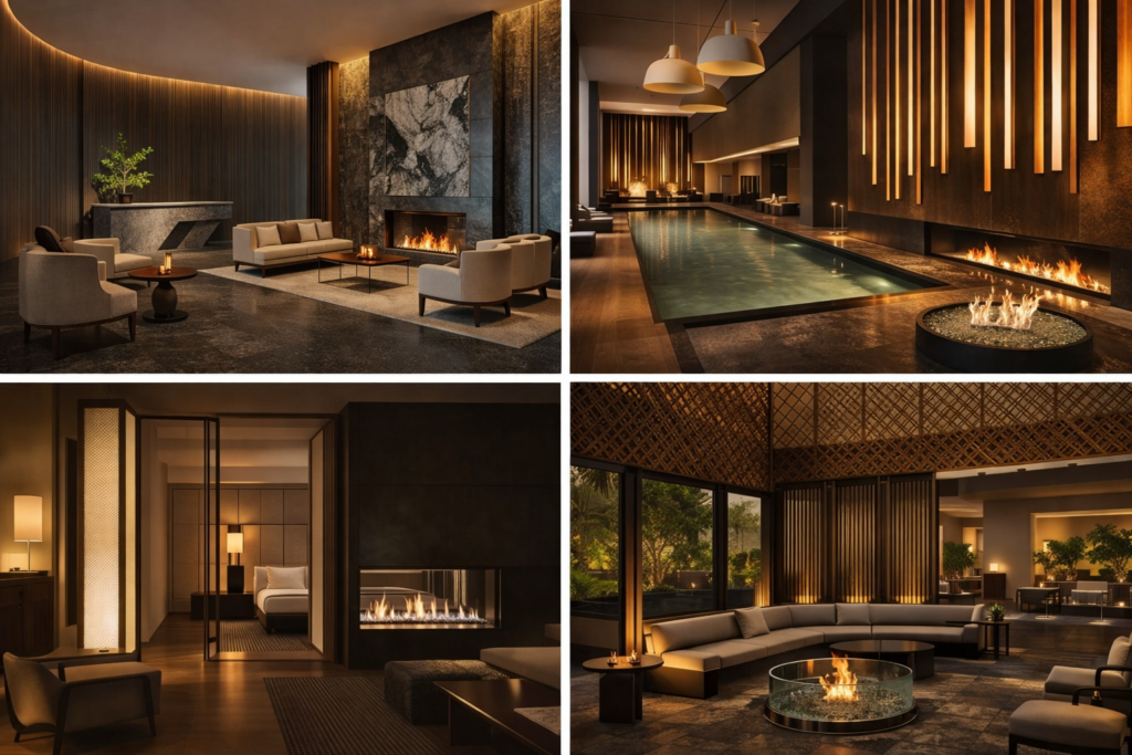 luxury hotel lounge inspired by Aman New York design with marble fireplace warm lighting and minimalist luxury furniture