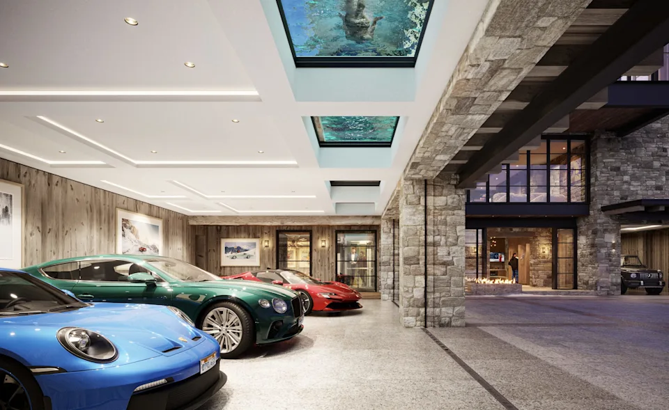 True to its cinematic lineage, Snowfall accommodates serious automotive collections. The property includes a motor court and multiple garages designed to house luxury vehicles, including Aston Martins, alongside dedicated spaces for ATVs and snowmobiles.