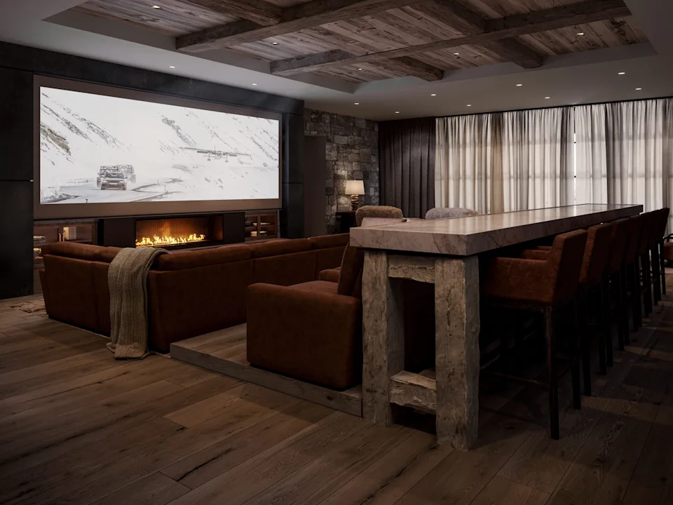 Despite its modernist profile, Snowfall’s interiors are intentionally inviting. Hand-cut Montana Moss Rock, reclaimed timber, and refined natural materials soften the structure’s bold geometry. No fewer than 16 fireplaces are integrated throughout the estate, creating an atmosphere of warmth rarely achieved at this scale.